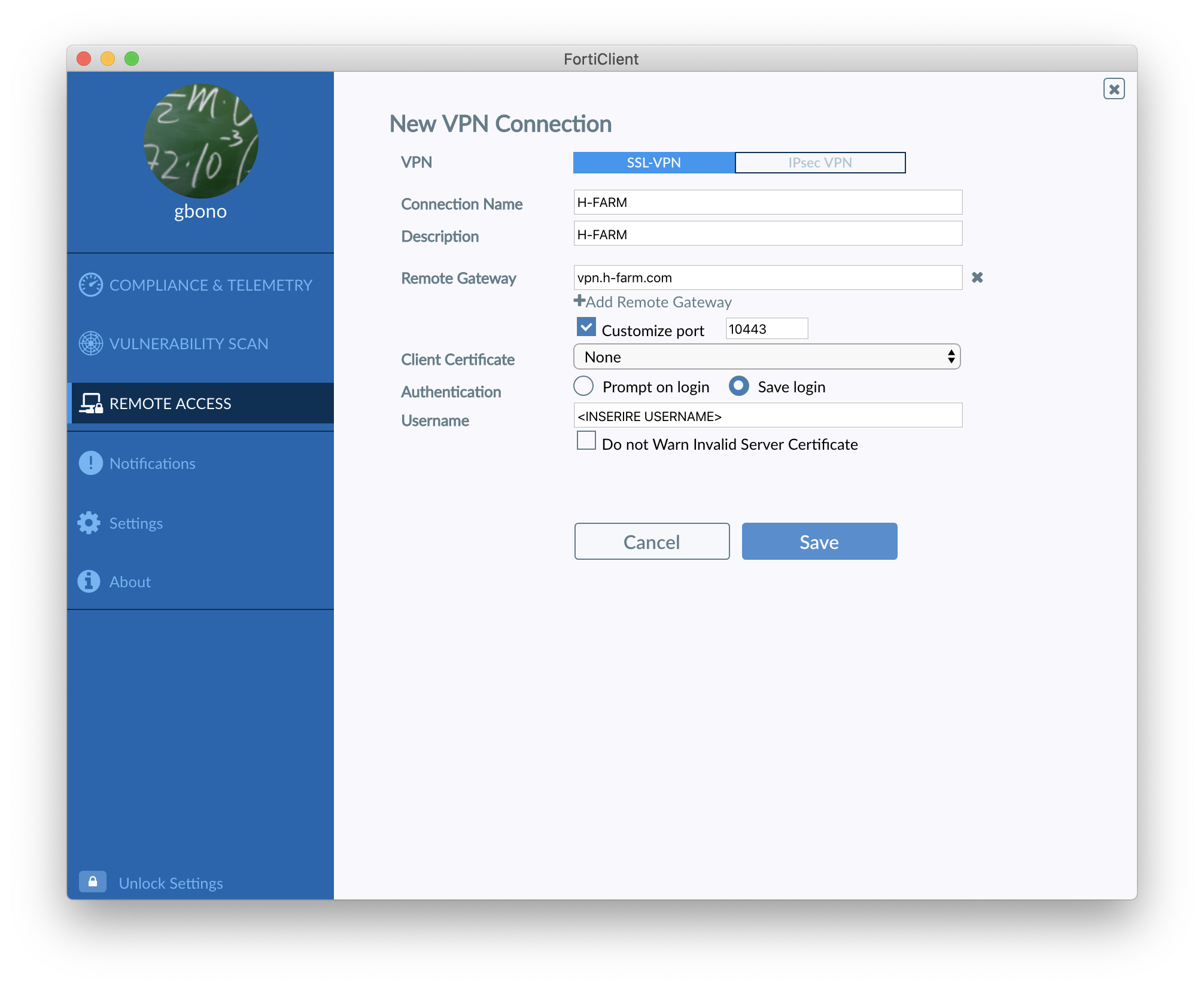 - Appena scaricato basterà installarlo ed eseguire il login (sempre con le credenziali dell'account H-FARM), poi cliccare su Remote Access nella sidebar e poi Configure VPN ed applicare la seguente configurazione: